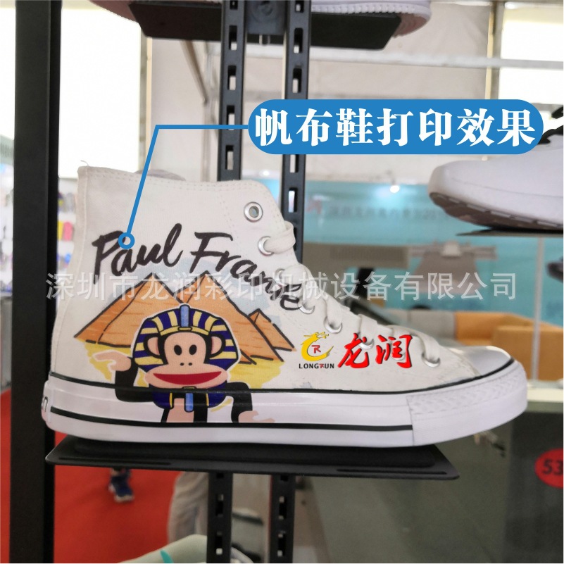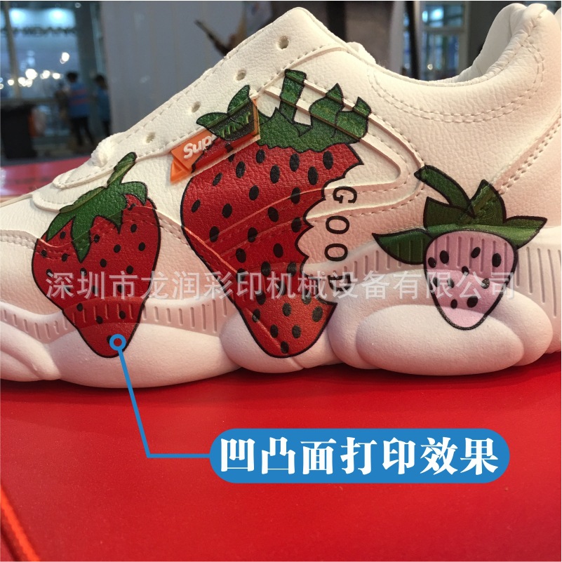 龍潤LR-2513 uv打印機實現(xiàn)從2.5毫米打印距離到2.5厘米打印距離的,直接打印高弧度,實現(xiàn)uv打印高弧面,uv打印異形,uv打印鞋面,uv打印凹凸面,uv打印玩具等高落差產(chǎn)品,無需制版,直接打印。2513UV高落差平板噴墨打印機是針對鞋子/鞋材行業(yè)的專用機型,其有高落差、高噴射、打印精度高、質(zhì)量好、色彩鮮艷、打印速度快、圖案清晰亮麗、不掉色等特點。打印落差25mm不飛墨,打印方便,無需制版,只要有圖片,連接一臺電腦就可以直接在成品鞋或者鞋材上面印刷自己想要的3D圖案。因為設(shè)備針對不同客戶,不同行業(yè),所以在機器配置和機器大小選購方面存在差異,價格也高低不一,客戶在購買機器前務(wù)必要咨詢銷售人員,我們才能推薦適合您的機器。